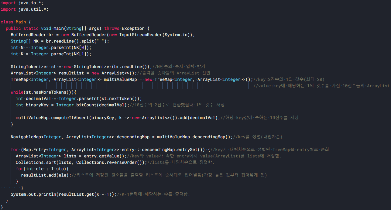 이 문제를 풀기 위해 우선 2진수로 변환했을때 1의 갯수 별로 10진수 숫자들을 저장한다. 이때 사용한 자료구조는 TreeMap이다. key값은(1의 개수는) 1부터 20까지 있고 각 key에 해당하는 10진수들을 value인 ArrayList에 담는다.