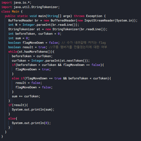 이번 구현 문제는 수가 오름차순이었다가 내림차순으로 바뀌는데 다시 오름차순으로 변하는 지 알아내는 문제이다. 이 문제를 flag 변수를 활용해서 풀었다.