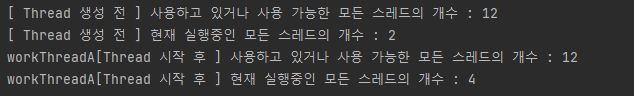 System.out.println(workThreadA.getName() + "[Thread 시작 후 ] 사용하고 있거나 사용 가능한 모든 스레드의 개수 : " + Runtime.getRuntime().availableProcessors());